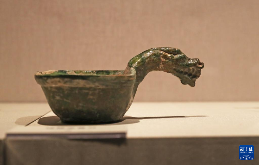 2月2日在遼寧省博物館拍攝的綠釉龍首勺。