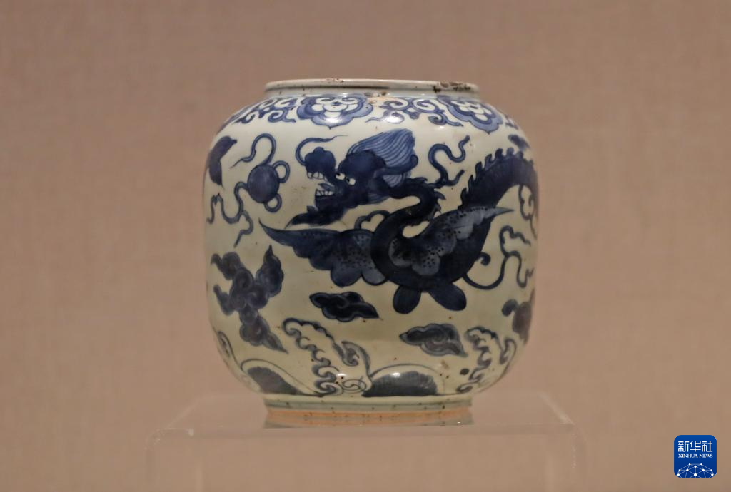 2月2日在遼寧省博物館拍攝的青花飛龍紋罐。