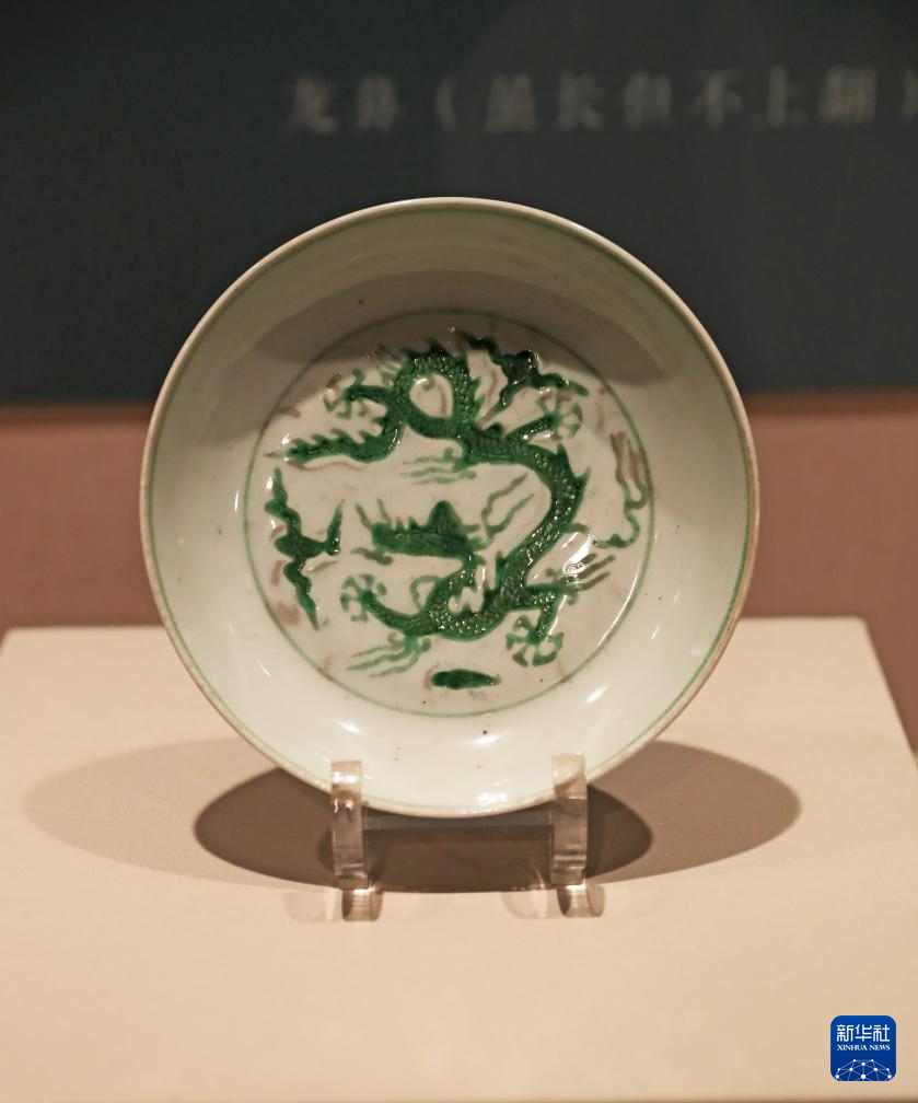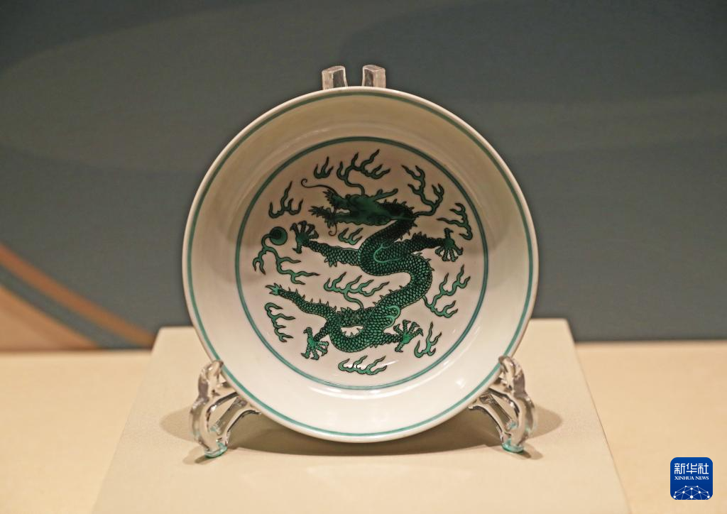 2月2日在遼寧省博物館拍攝的雕填綠彩龍紋盤。