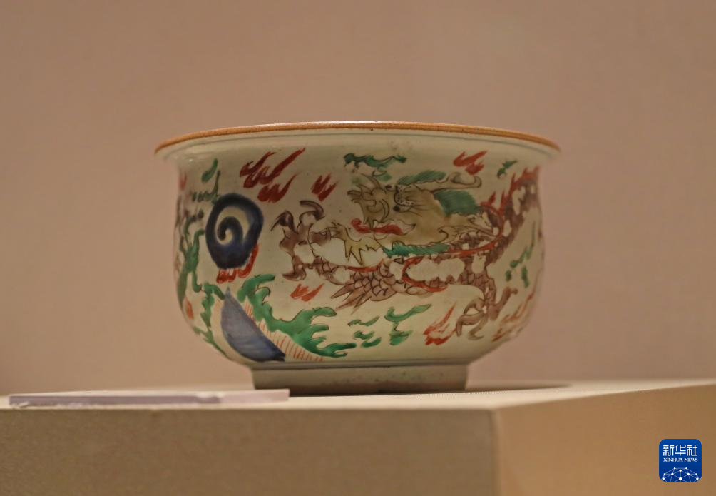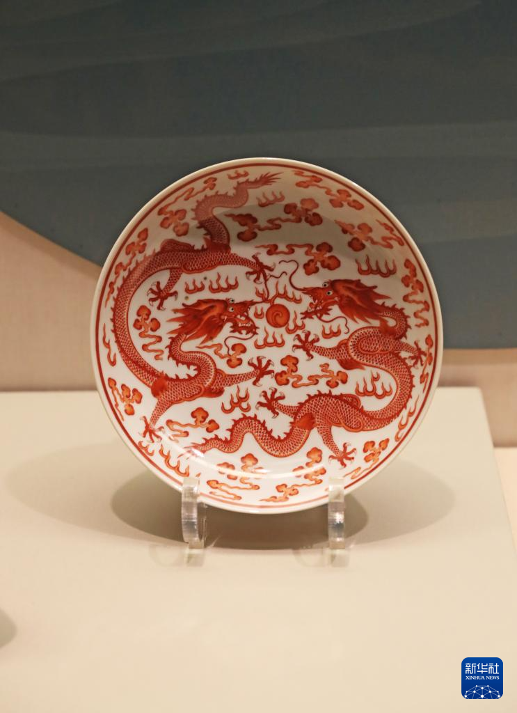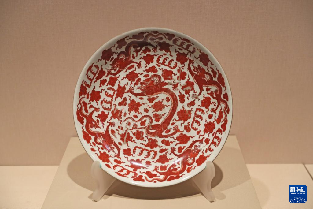 2月2日在遼寧省博物館拍攝的礬紅彩雙龍戲珠紋盤。