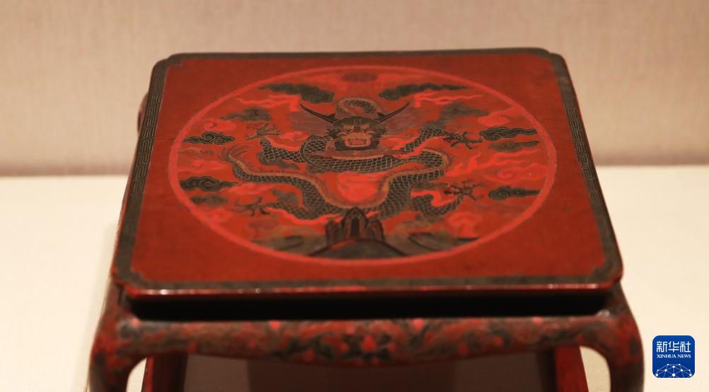 2月2日在遼寧省博物館拍攝的平涂朱漆雕云龍小方幾。