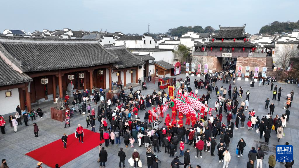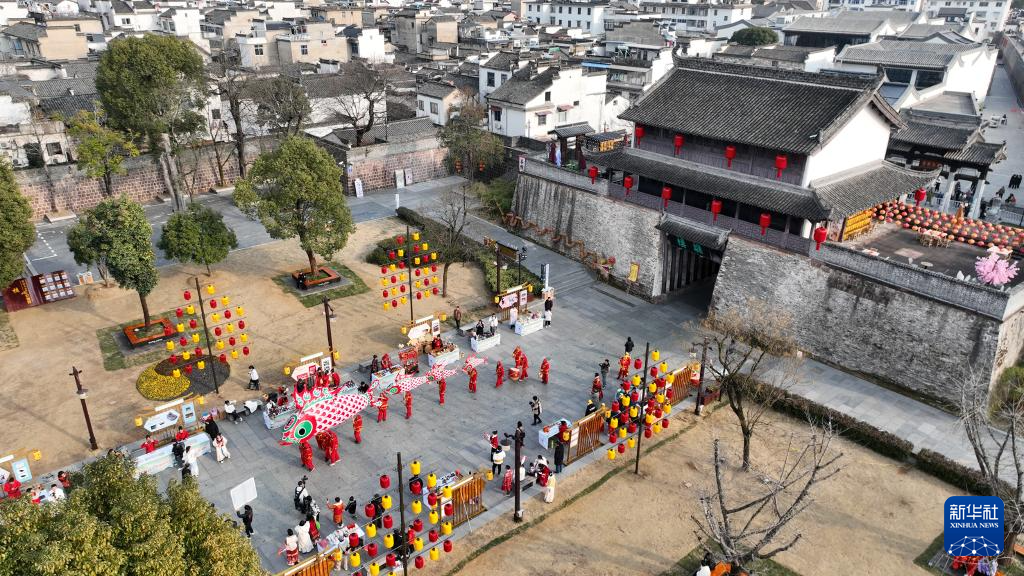 1月27日,黃山市歙縣徽州古城舉行魚燈巡游(無人機照片)。