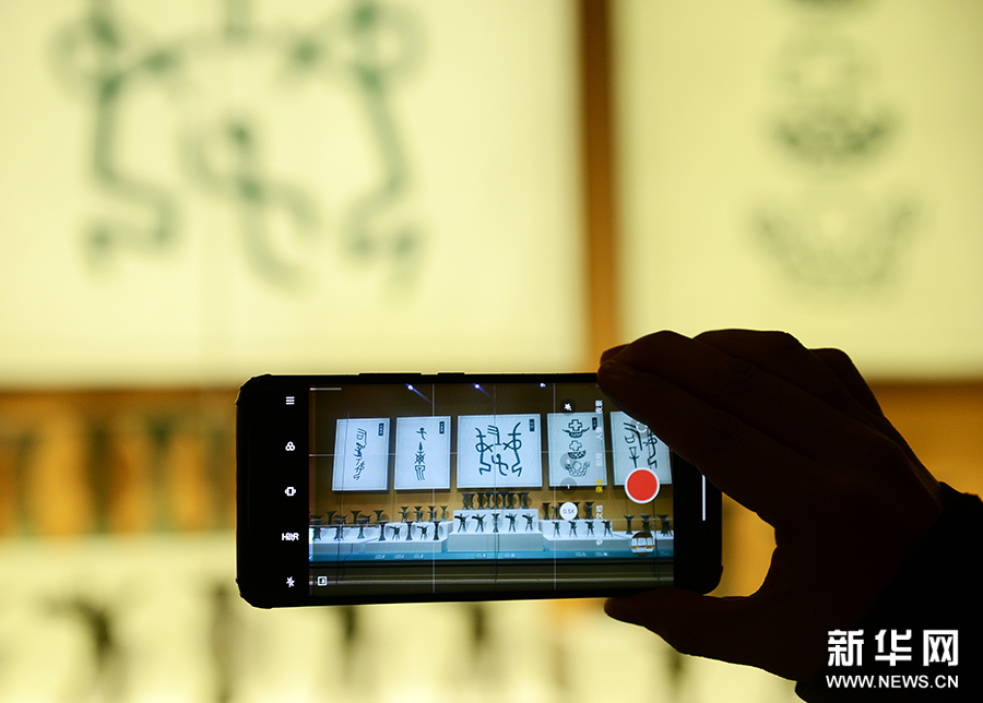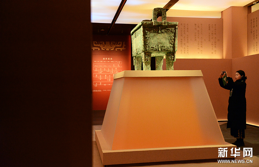 2月26日,河南省安陽市殷墟博物館新館,游客在拍攝展品。