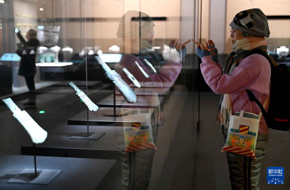 2月26日,參觀者在河南安陽殷墟博物館新館內觀看展品。