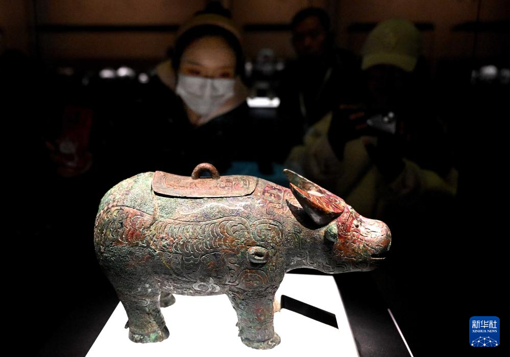2月26日,參觀者在河南安陽殷墟博物館新館內觀看展品“亞長”牛尊。