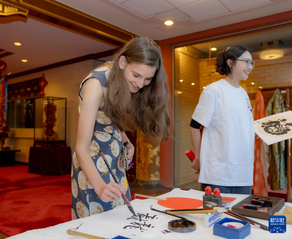 2月27日,在澳大利亞堪培拉中國駐澳大利亞大使館,來賓體驗中國書法。