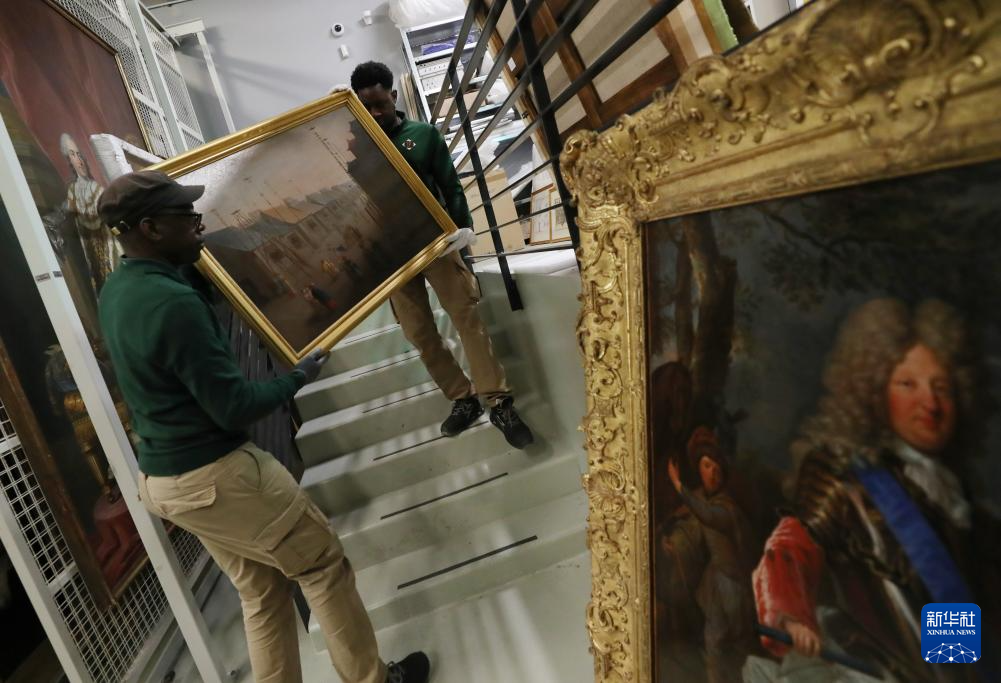 3月11日,在法國巴黎近郊的凡爾賽宮,工作人員打包油畫《路易十四戎裝像》。
