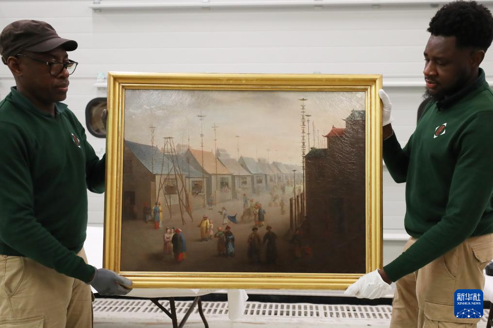 3月11日,在法國巴黎近郊的凡爾賽宮,工作人員準備打包油畫《南京的集市》。
