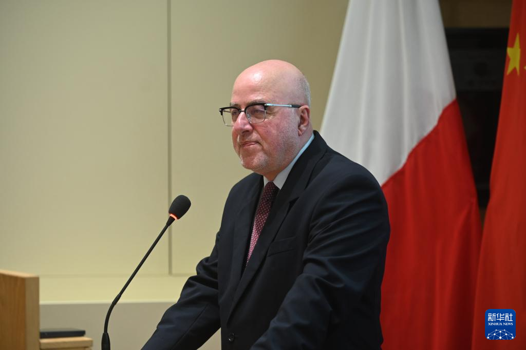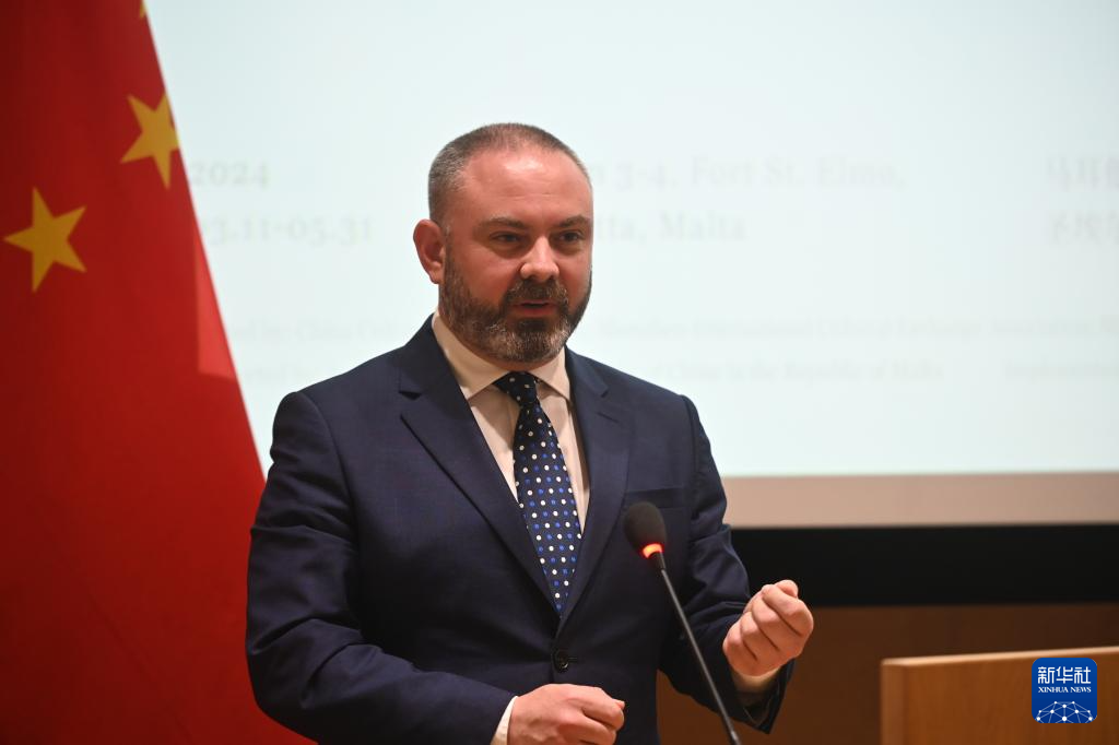 3月15日,在馬耳他瓦萊塔,馬耳他國家遺產、藝術和地方政府部長邦尼奇在馬耳他藝術雙年展中國館開幕式上致辭。