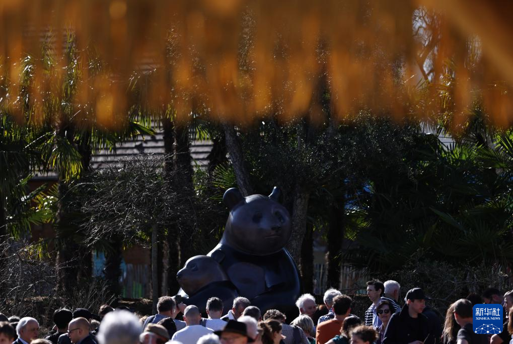 3月22日,在法國中部城市圣艾尼昂的博瓦勒野生動物園舉行的揭幕儀式上,人們觀看大熊貓雕塑。