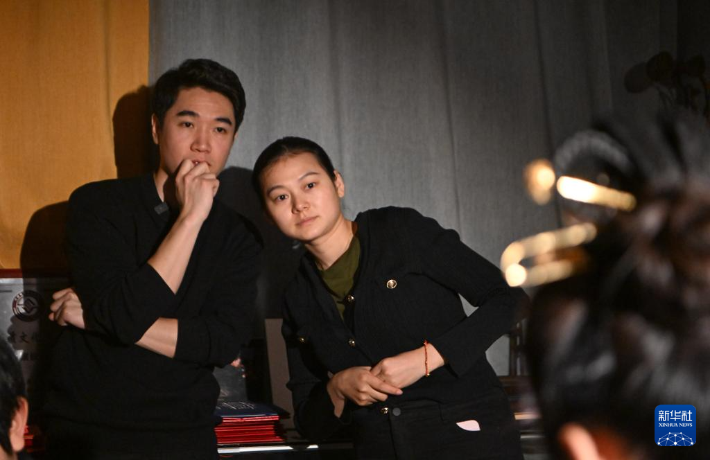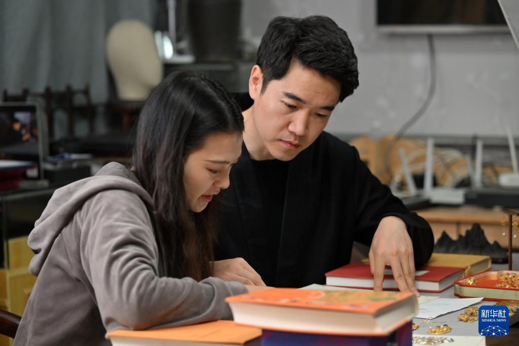 馬賽(左)在工作室內與女朋友閔方蘋在漢服愛好者佩戴頭飾時商討制作細節(3月7日攝)。