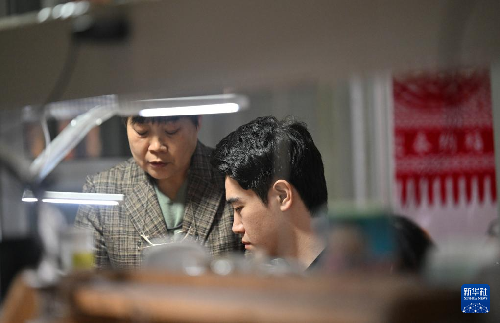 馬賽(右)在工作室內和母親交流制作技藝(3月19日攝)。
