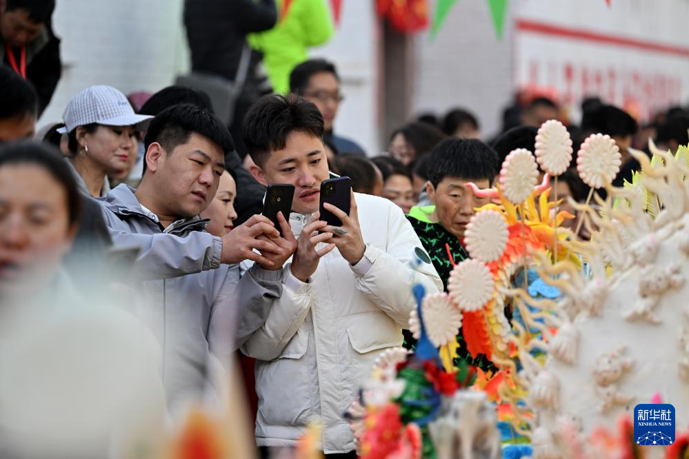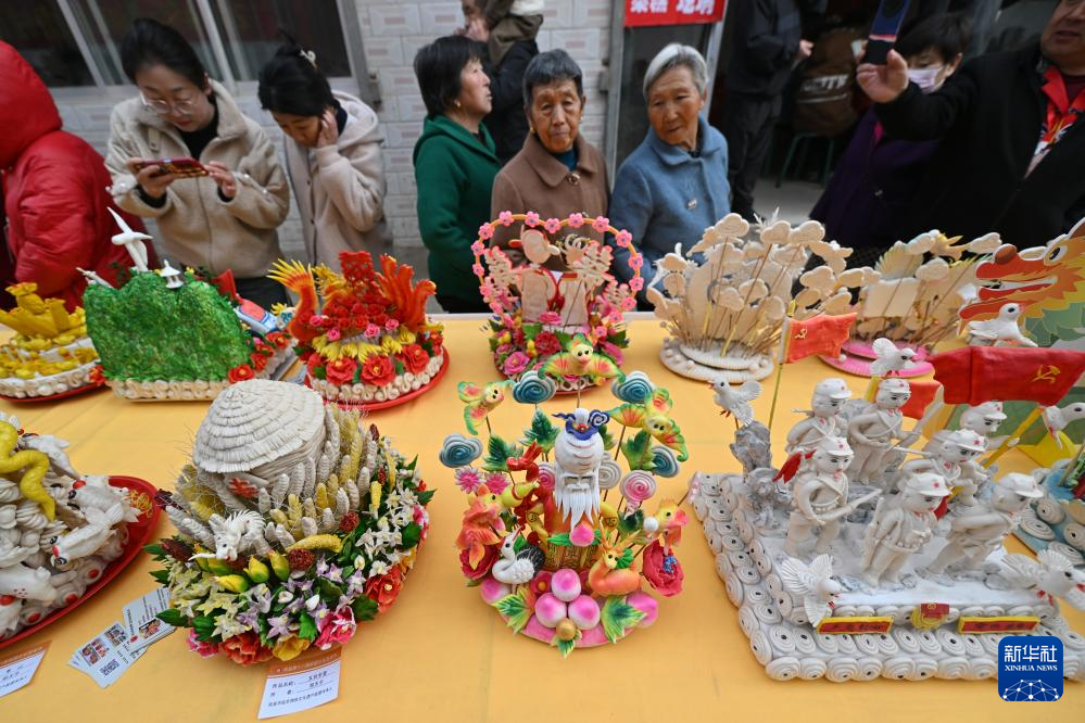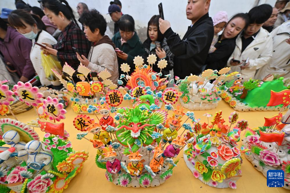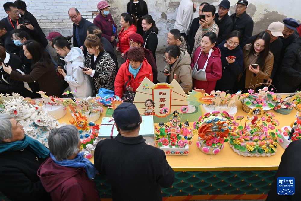 3月28日,在山西省嵐縣嵐城鎮,人們用手機拍攝面塑作品。