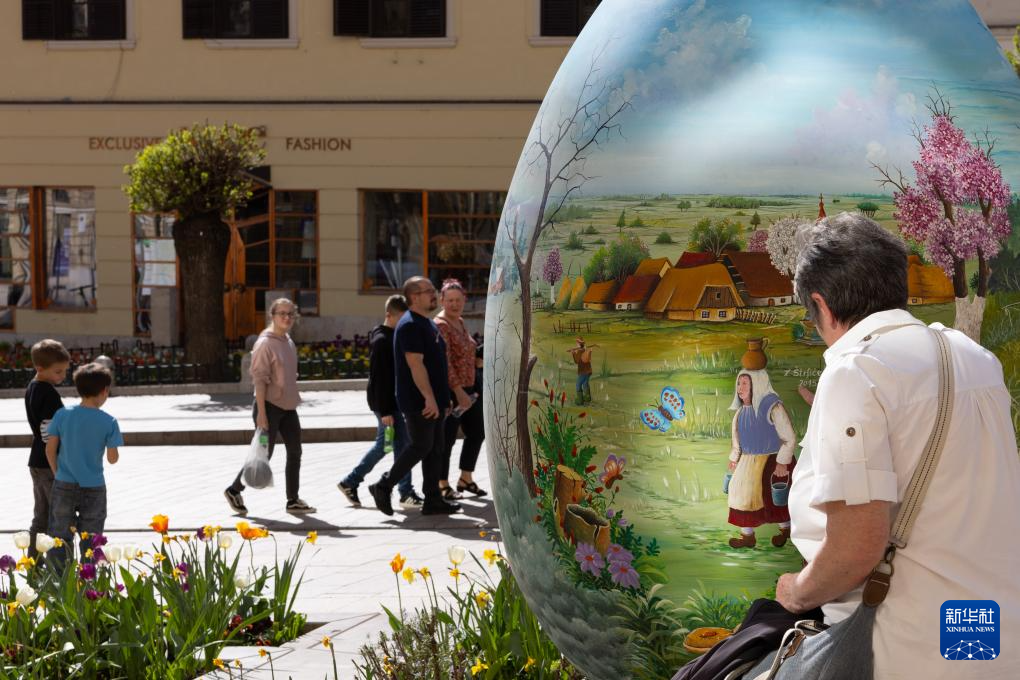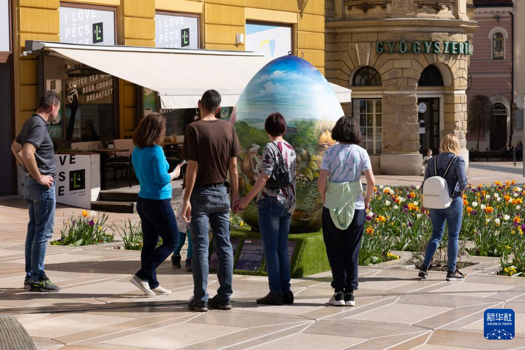 3月30日,人們在匈牙利南部城市佩奇街頭參觀復活節巨型彩蛋。新華社發(弗爾季·奧蒂洛攝)