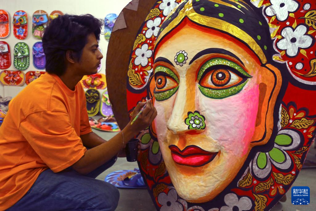4月7日,在孟加拉國首都達卡,達卡大學的學生繪制孟歷新年慶?;顒铀璧墓に嚻?。