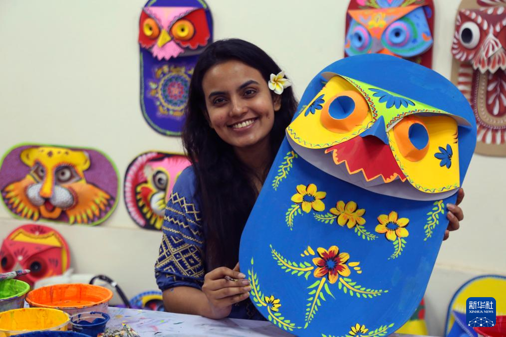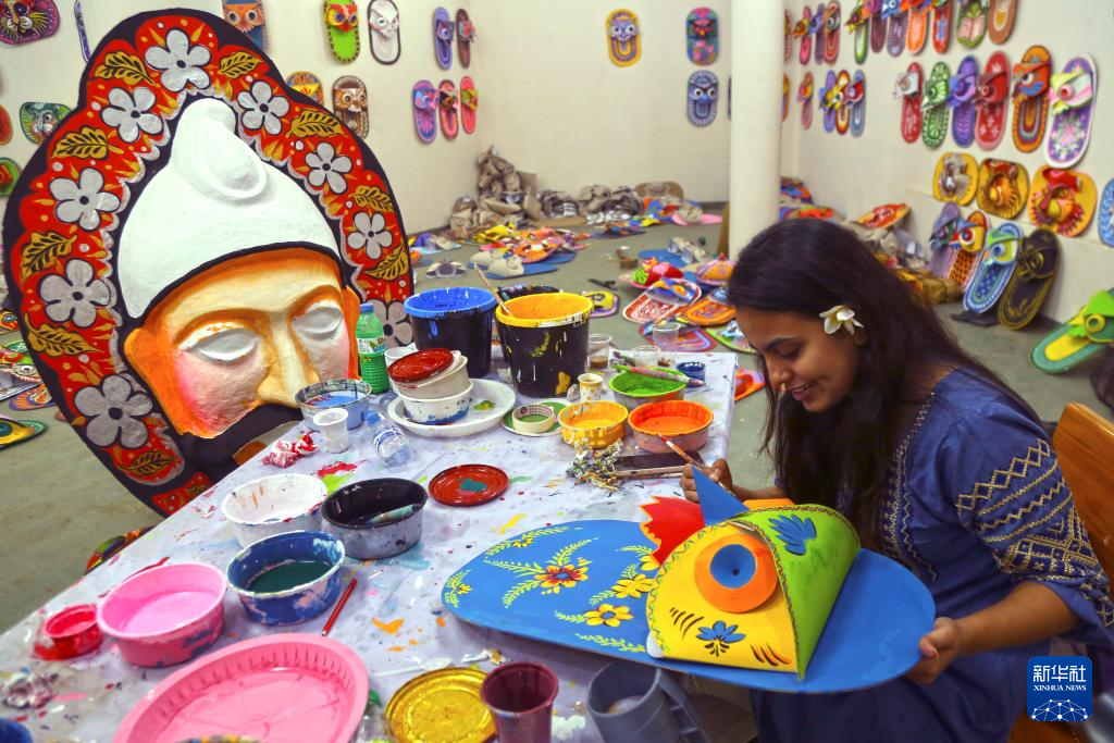 4月7日,在孟加拉國首都達卡,達卡大學的學生展示孟歷新年慶?;顒铀璧墓に嚻?。