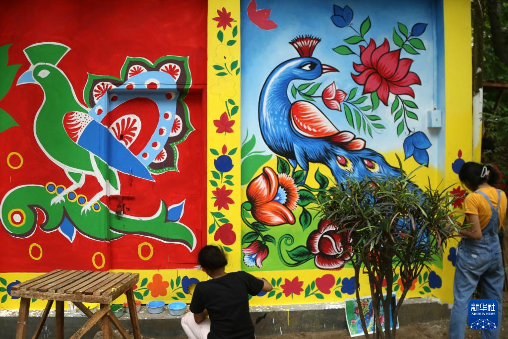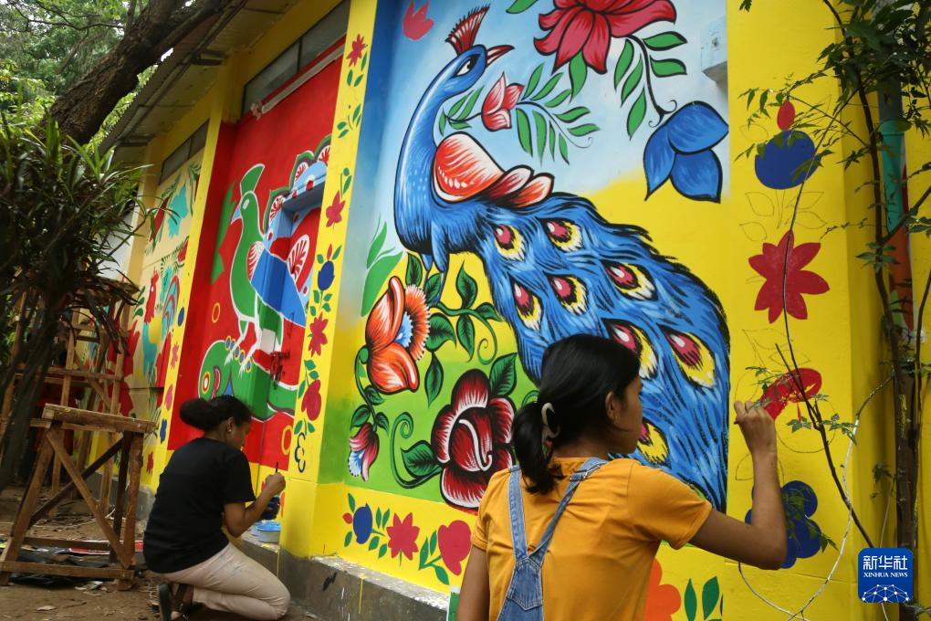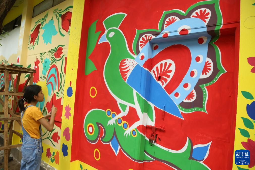 4月7日,在孟加拉國首都達卡,達卡大學的學生在墻壁上進行彩繪,迎接孟歷新年。