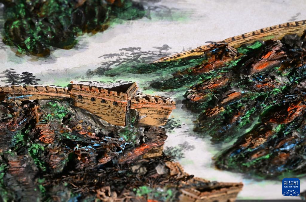 由陳瑞明傳承的陳氏樹皮畫制作技藝是河北省承德市非遺項目,該技藝以樹皮為主要材料,輔以苔蘚、干花、樹葉等,通過刻、雕、燙等技法制成立體山水畫。