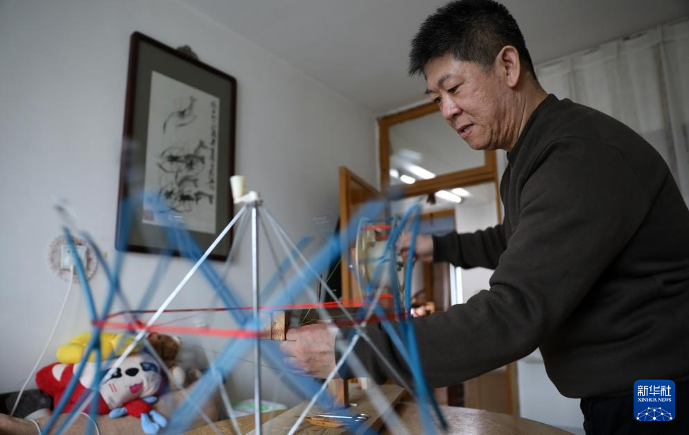 4月9日,申濤在位于營口市的家中用搖線機進行搖線。