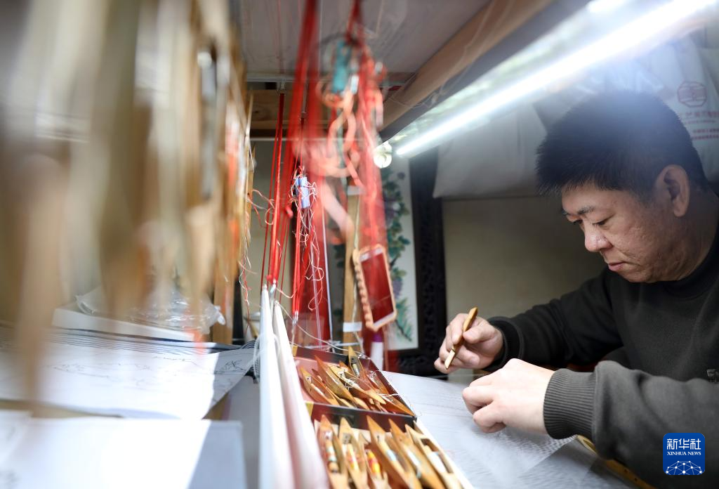4月9日,在位于營口市的家中,申濤左手拿著纏著絲線的梭子,右手拿著梳理絲線的撥子進行緙絲作品創作。