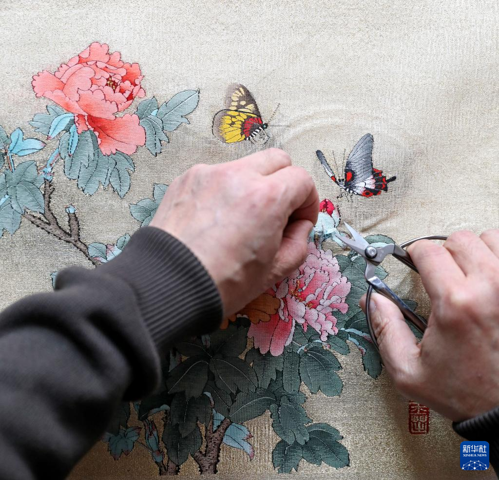 4月9日,申濤在位于營口市的家中進行緙絲作品的最后一道工序——修毛頭。
