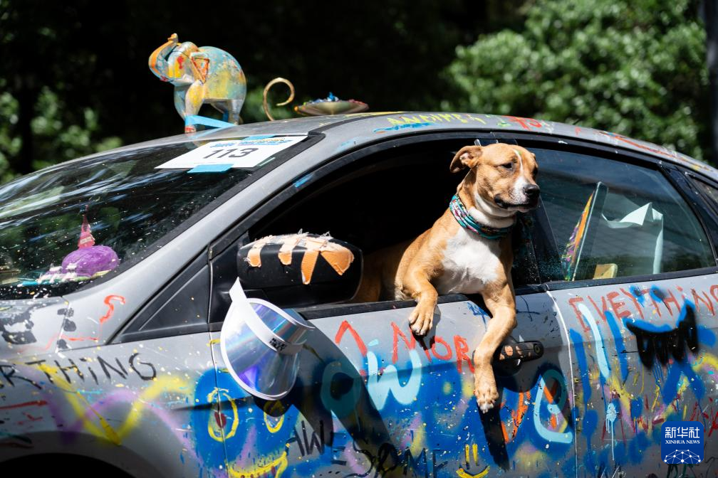 4月13日,一只狗乘車參加在美國休斯敦舉行的第37屆藝術汽車巡游活動。