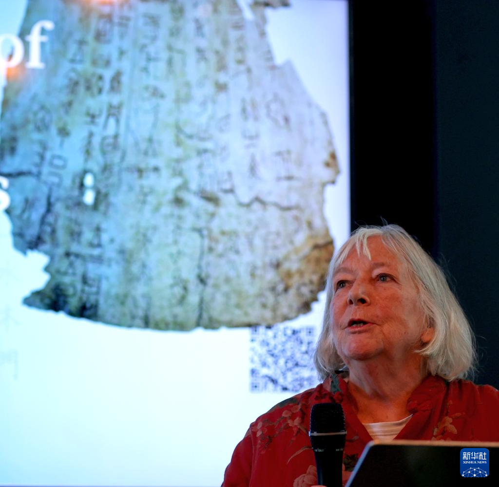 4月20日,在英國倫敦,英國知名漢學家弗朗西絲·伍德(中文名吳芳思)出席“漢字演變”主題展覽。