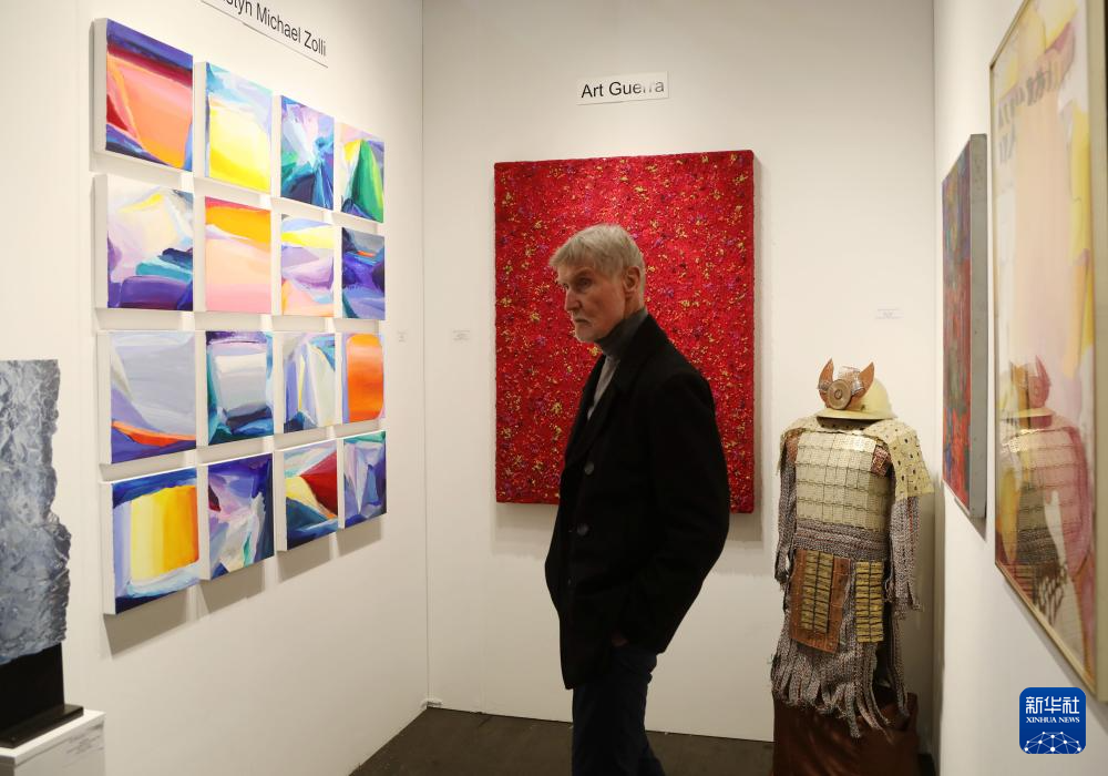 4月25日,在美國舊金山梅森堡中心舉行的舊金山藝術博覽會上,一名男子觀看藝術作品。
