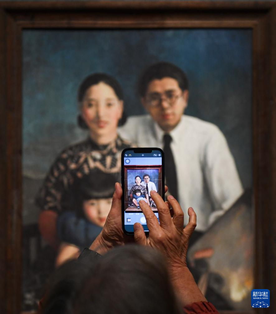 4月29日,觀眾在中國工藝美術館拍攝常沙娜父親常書鴻所作的油畫《畫家家庭》(高仿真作品)。