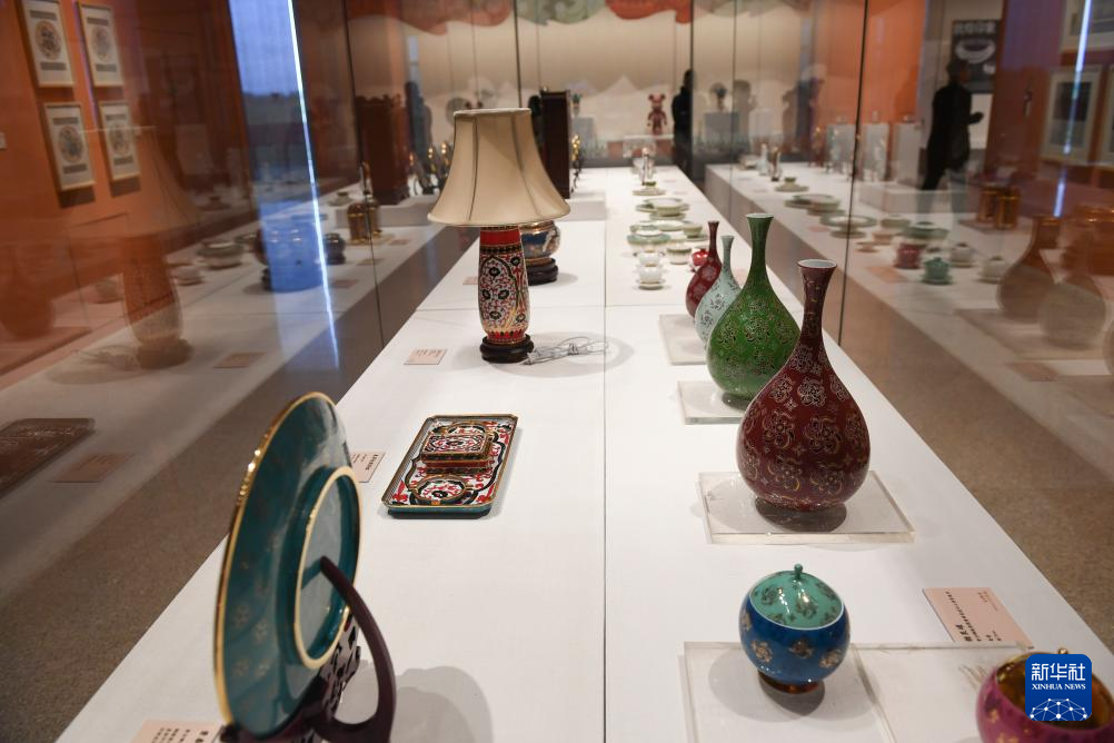 4月29日拍攝的常沙娜藝術作品在中國工藝美術館展柜玻璃上的映像。