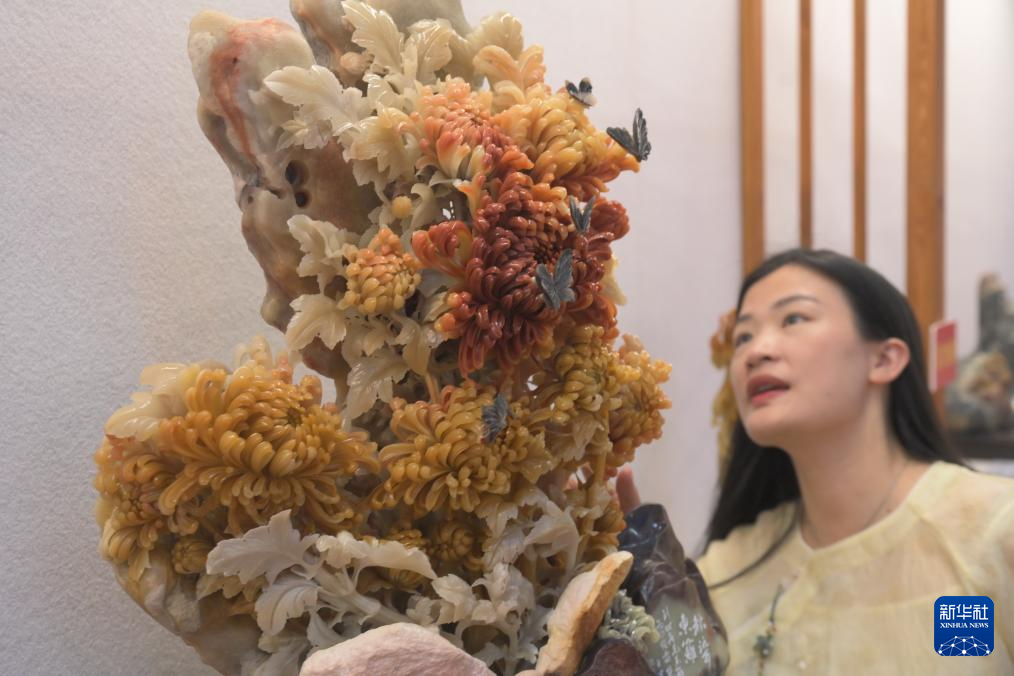 5月10日,參觀者在博覽會上欣賞雕刻作品。