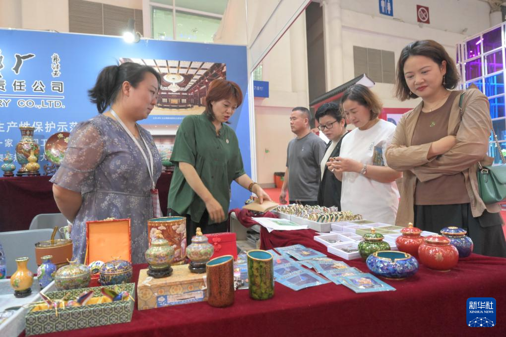 5月10日,觀眾在博覽會現場參觀景泰藍工藝品。