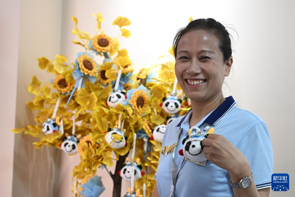 5月12日,“美麗工坊”項目殘疾女性代表唐占鑫展示絨線鉤織玩偶。