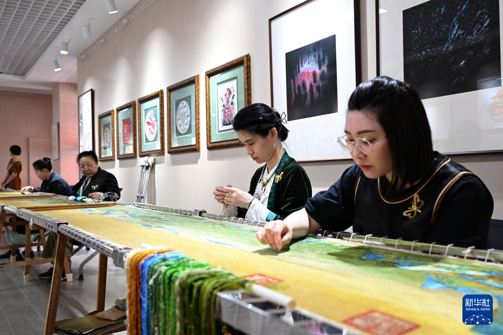 5月12日,殘疾繡娘在展覽現場繡制《千里江山圖》。