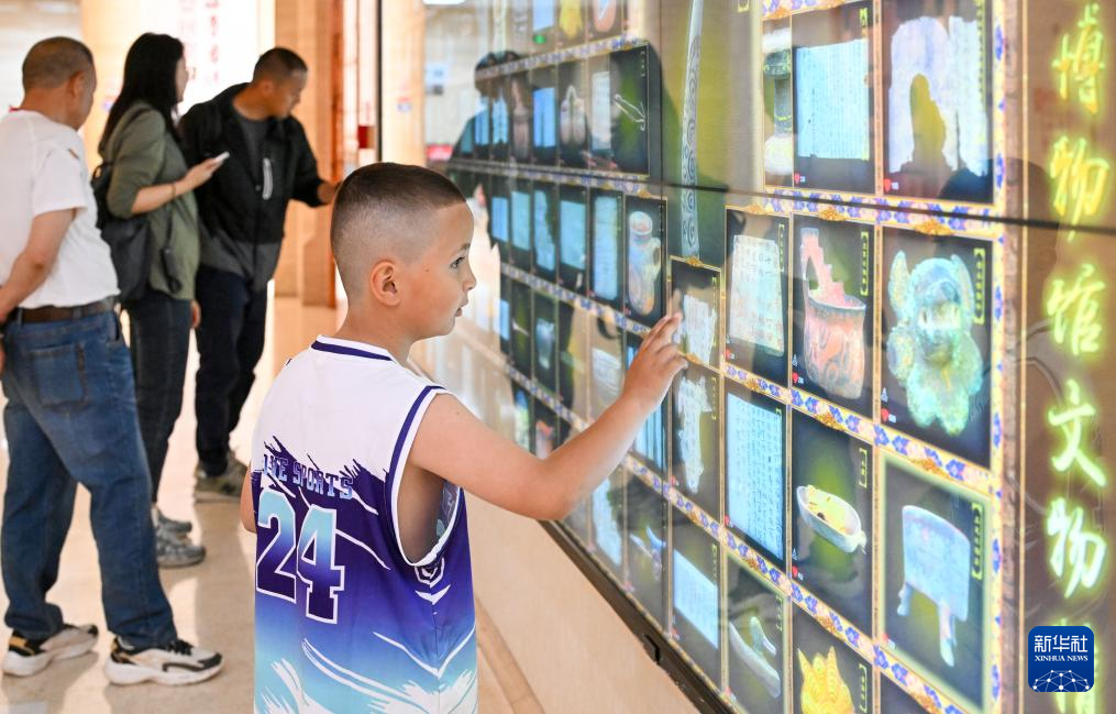 5月14日,游客在吐魯番博物館文物數字展示區參與互動。