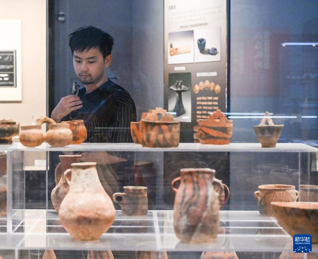 5月14日,游客在吐魯番博物館通史展廳觀看彩陶罐。