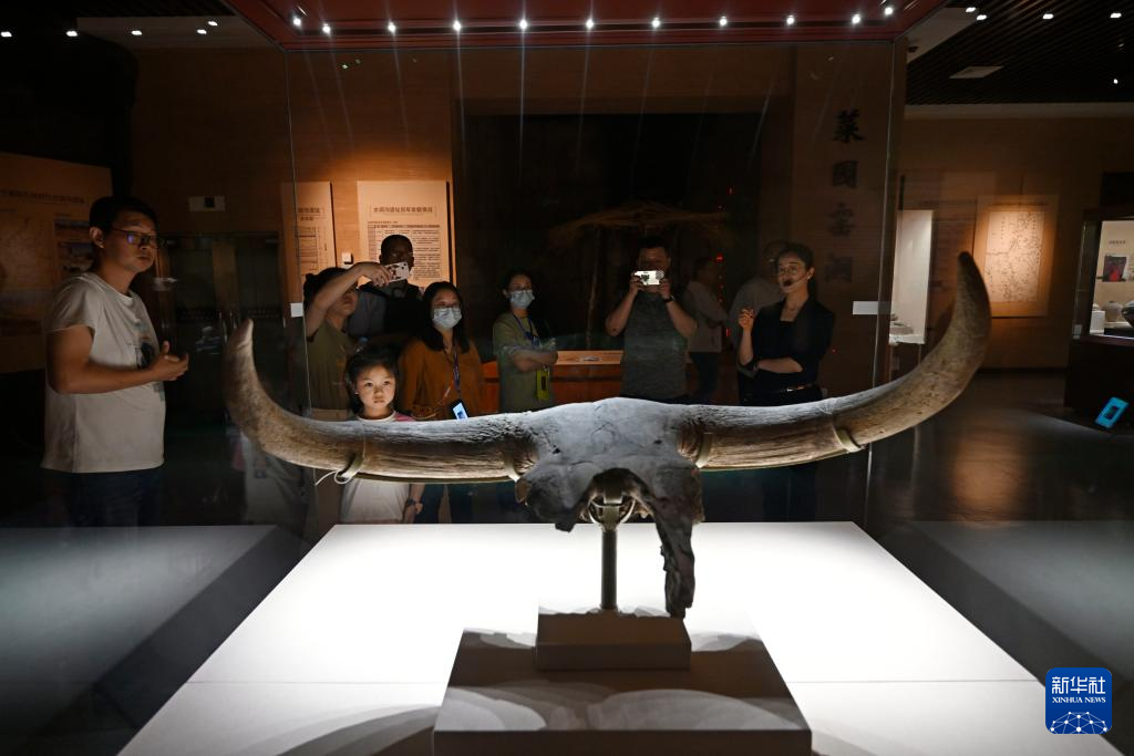 游客在寧夏博物館欣賞展出的牛頭化石(5月14日攝)。