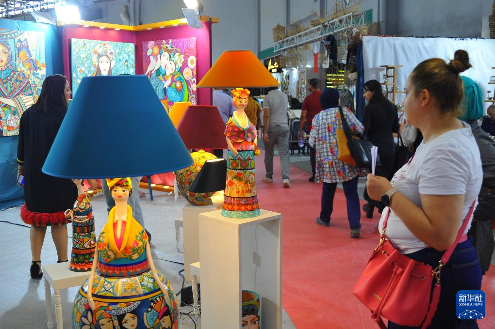 5月25日,一名參觀者在突尼斯首都突尼斯市的手工藝品展覽上觀賞臺燈。