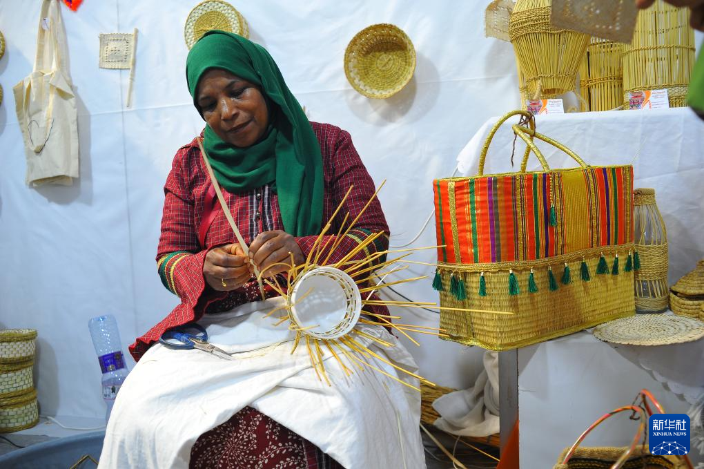 5月25日,一名參展商在突尼斯首都突尼斯市的手工藝品展覽上制作手工編織品。