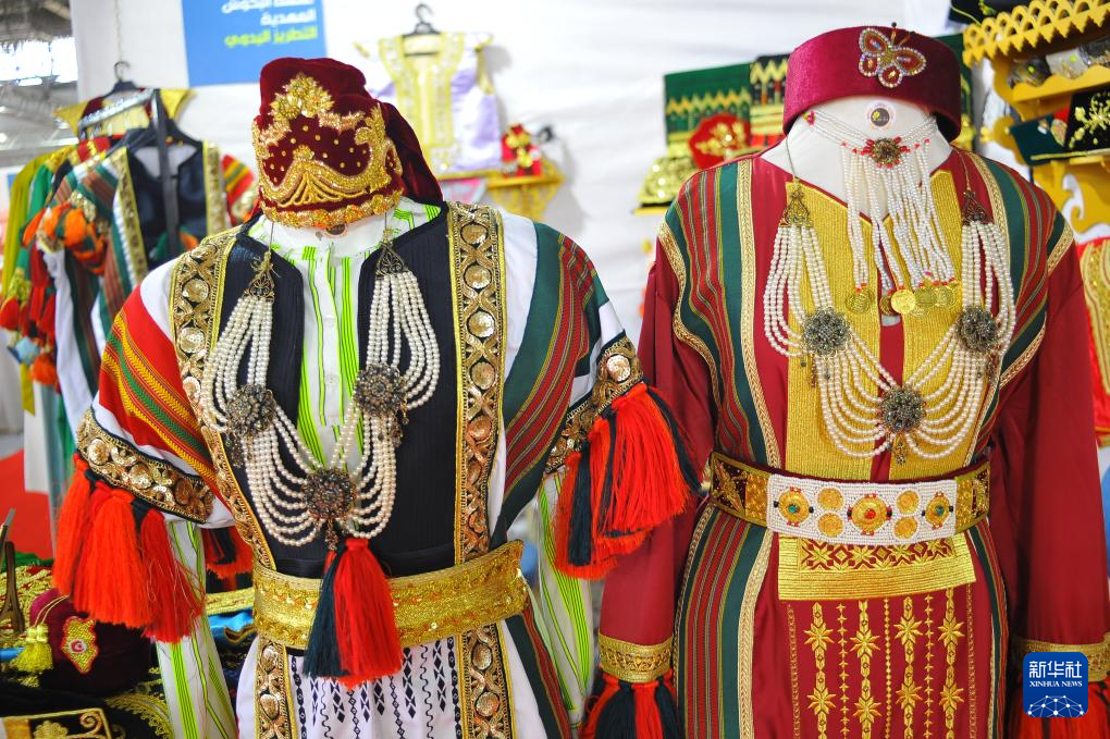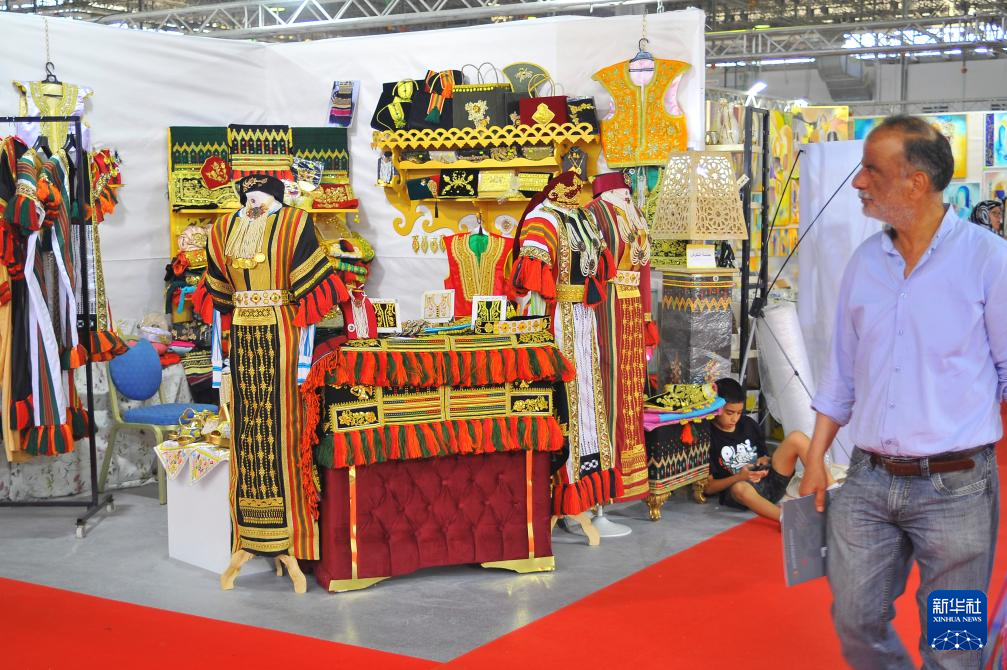 這是5月25日在突尼斯首都突尼斯市的手工藝品展覽上拍攝的突尼斯傳統民族服裝。