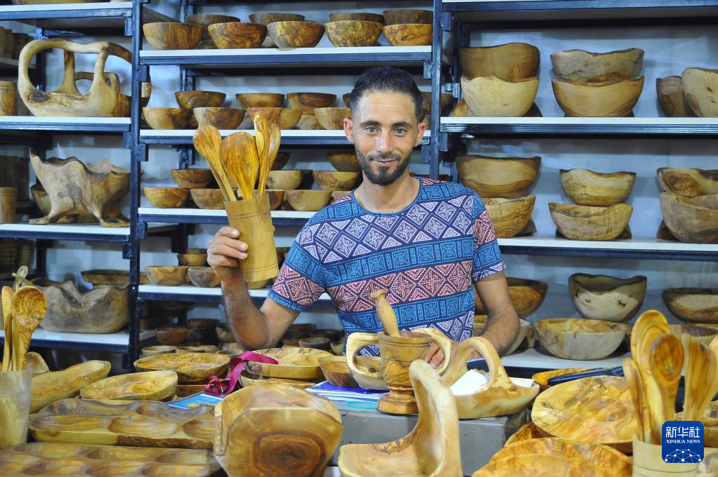 5月25日,一名參展商在突尼斯首都突尼斯市的手工藝品展覽上展示橄欖木制品。