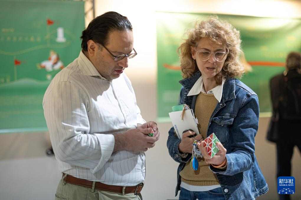 5月24日,在意大利羅馬,參觀者在“漢字中的文明密碼”展覽上體驗甲骨文主題魔方。