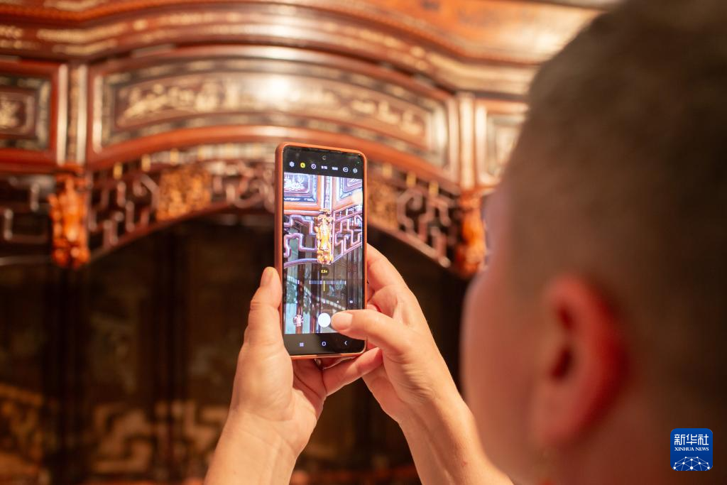 5月29日,在位于盧布爾雅那的斯洛文尼亞民族志博物館,參觀者拍攝“斯庫謝克亞洲珍品文物展”上的中國古典架子床。
