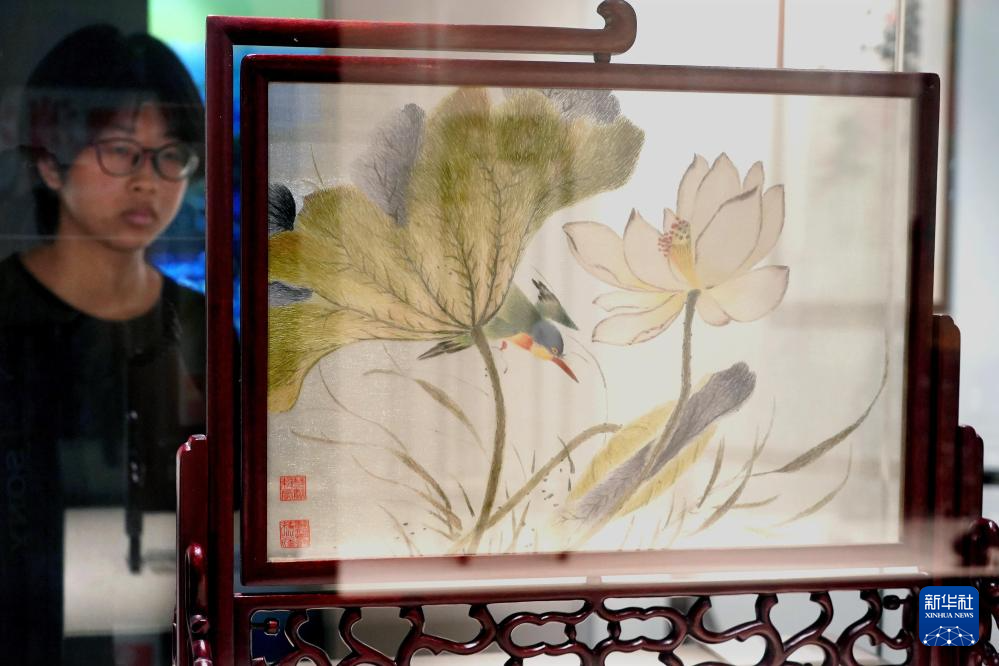 6月10日,小朋友在鄭州商代都城遺址博物院里觀看蘇州園林美學展上展出的蘇繡。