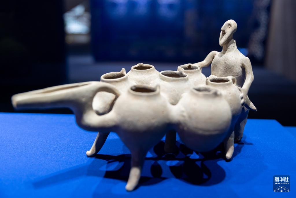 6月12日,在“古波斯的榮耀——伊朗文物精華展”上拍攝的“多罐人像陶來通”。