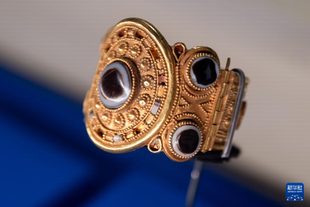 6月12日,在“古波斯的榮耀——伊朗文物精華展”上拍攝的“嵌瑪瑙金手鐲”。