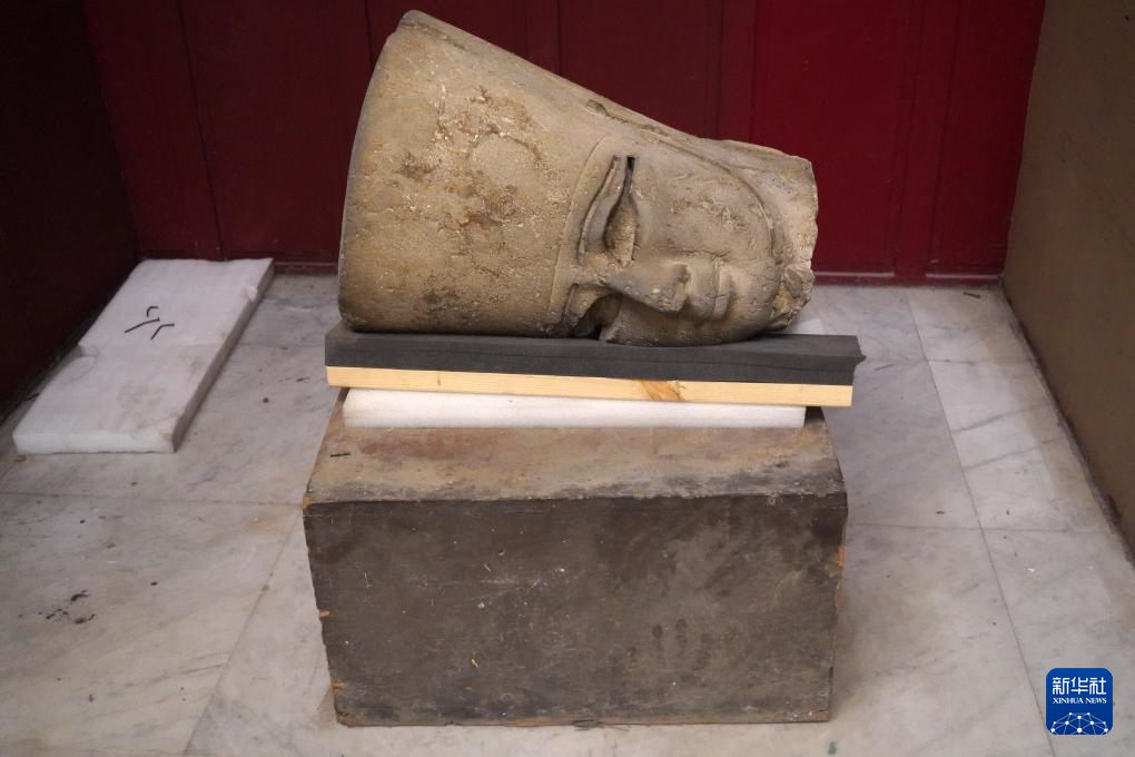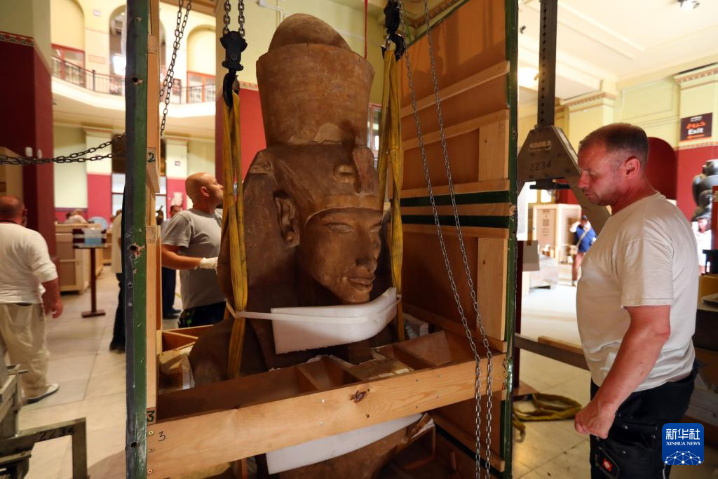 5月27日,在位于埃及首都開羅的埃及國家博物館,工作人員對古埃及18王朝法老埃赫那吞半身像進行吊裝。