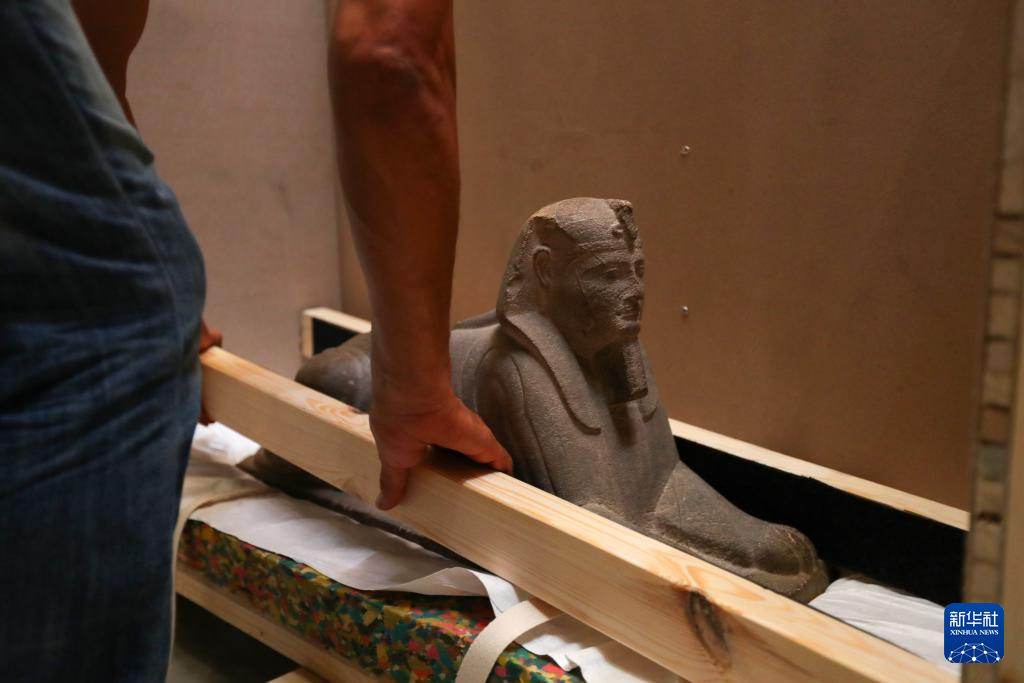 5月27日,在位于埃及首都開羅的埃及國家博物館,工作人員對一件斯芬克斯小雕像進行打包。