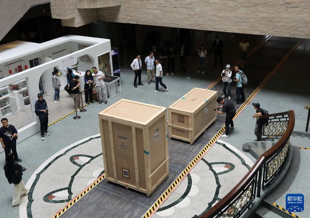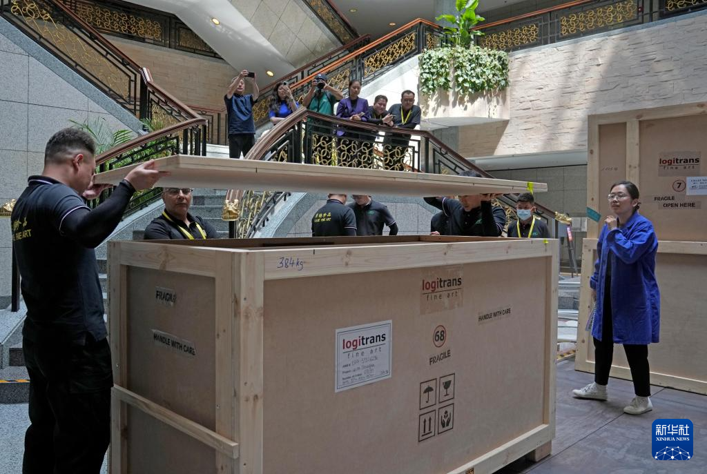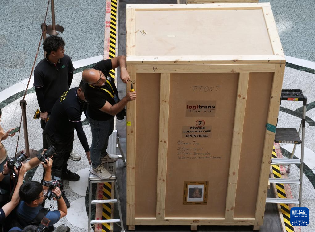 6月17日,在上海博物館人民廣場館,工作人員打開彩繪人形棺的包裝箱。