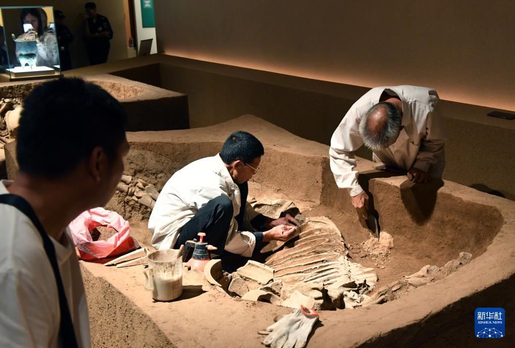 7月1日,兩名工作人員在殷墟博物館新館展區開展維護保養工作。